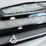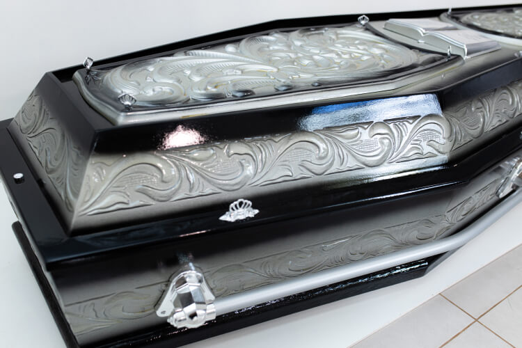 • Confecção: urna modelo sextavado, rodapé, bordada em alto relevo (massa), com duplo sobre tampo em plástico e caixa e tampa em MDF;