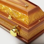 Confecção: urna modelo sextavado, rodapé, bordada em alto relevo (massa), com duplo sobre tampo e caixa e tampa em MDF;